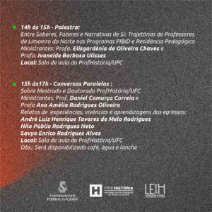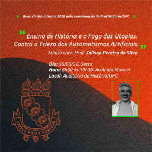 A Aula Inaugural das turmas de Mestrado e Doutorado 2026, ocorrerá no dia 06/03/2026 no Auditório da História – UFC/CH II (das 8h30 às 11h30) e na Sala do ProfHistória – UFC/CH II (das 14h às 17h).
